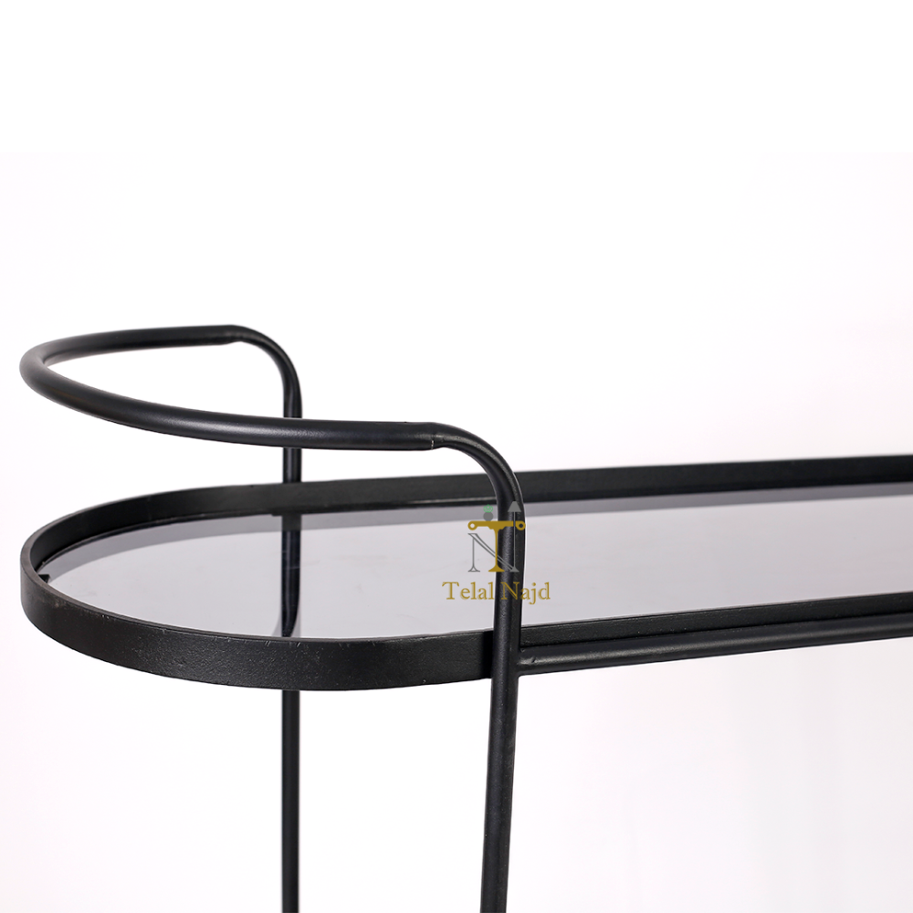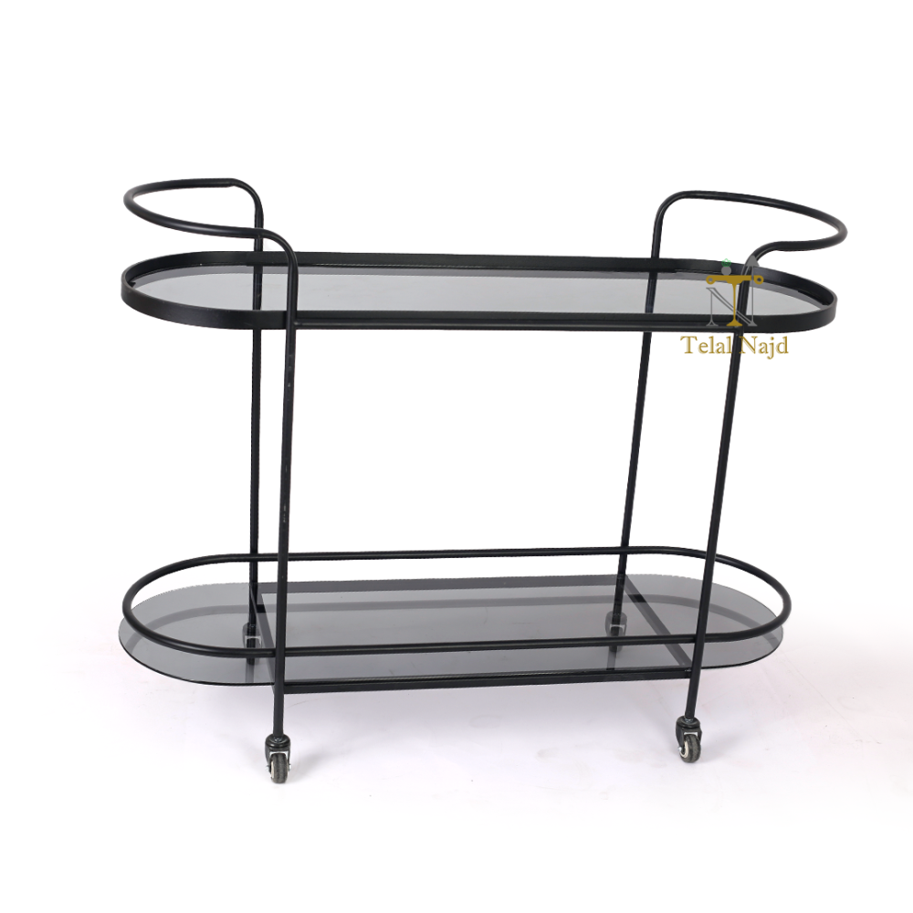 عربة تقديم ترولي دورين سطح زجاج شفاف أسود شكل بيضاوي الشكل وقواعد حديد لون أسود بتصميم عصري